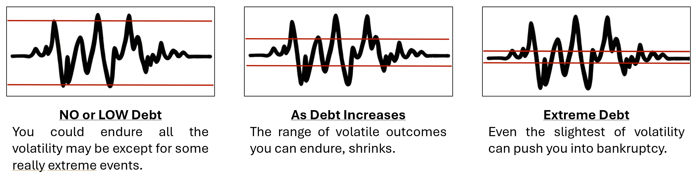 Another important and often overlooked characteristic regarding debt is that it reduces ENDURANCE. Morgan Housel puts it very nicely when he says, the more you borrow, the narrower the range of volatile outcomes you can endure. Pictorial summary below.