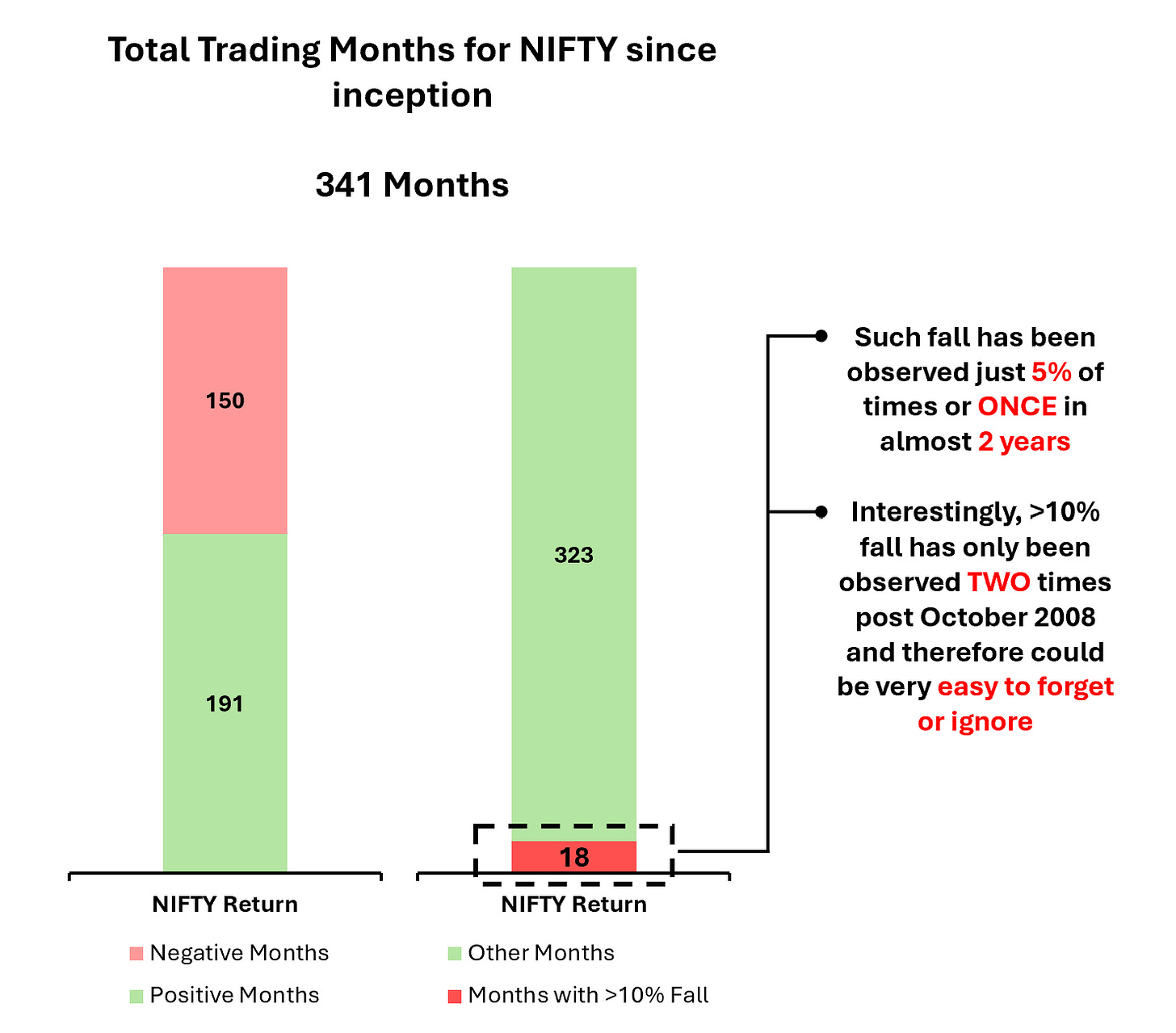 Looking at the above NIFTY Monthly Return chart gives us a great sense of how INFREQUENT these sharp falls can be. Long term investing success depends on your ability to endure such months where the quantum of negative return is a few times that of median and unfortunately, AVERAGE misses out on communicating this fact.