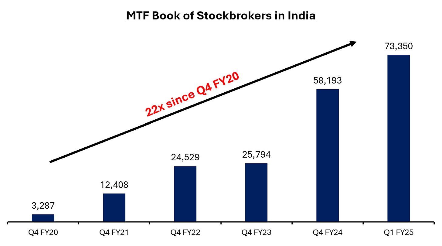 Reflecting this, Indian investors have significantly leveraged their portfolios. The total Margin Trading Facility (MTF) book of brokers in India has exploded, increasing by an astonishing 22x since Q4 FY20. Brokers remain bullish on this lucrative business, and for good reason—the returns they generate from this venture far exceed the NIFTY's compound annual growth rate since its inception, all with virtually zero risk.